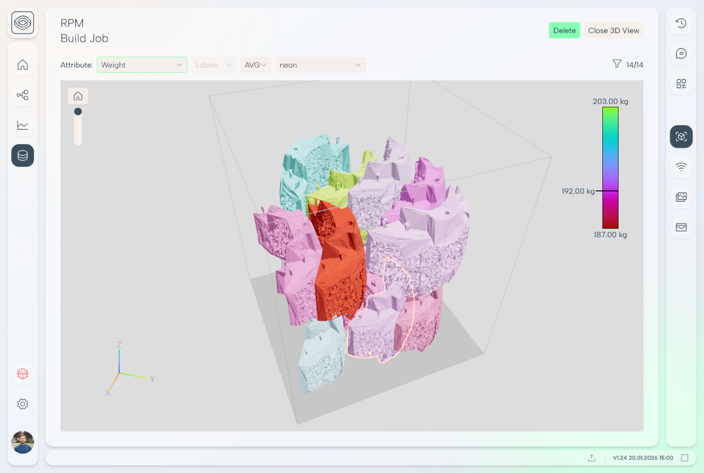 Figure 2: 3D representation of the build job with a visualisation of the measured weight of the components